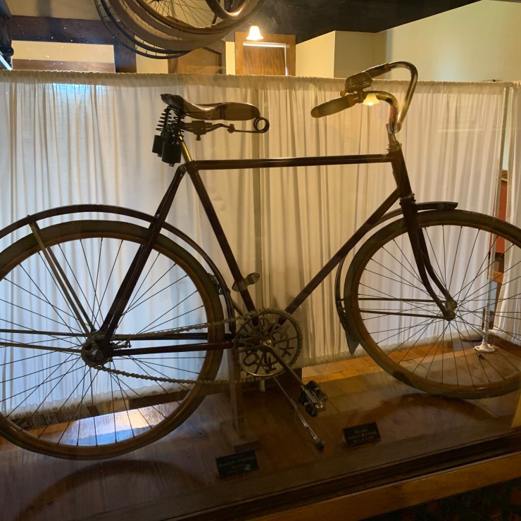 now in this picture you can not see the rims very well but they are made of wood And this is the type of bike he would be riding with the Boy Scouts. I learned that That the Wright brothers had a bicycle shop and made this bicycle .So I guess like learning to crawl before you walk or (ride before you fly)Now back on the ride towards home